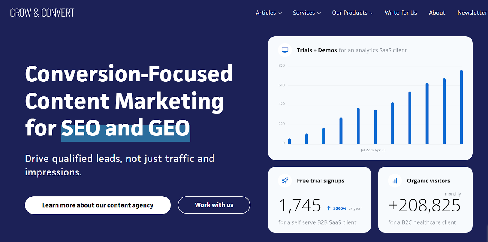 Grow and Convert: Best for B2B SaaS brands that care more about conversions than traffic volume and want bottom-of-funnel content built around their "Pain Point SEO" methodology.