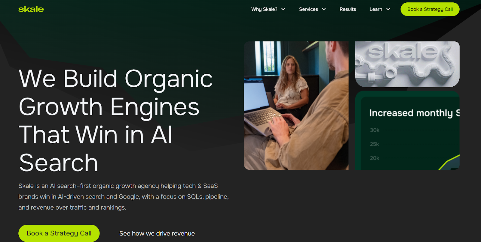 Skale is a London-based B2B SaaS SEO agency that serves US and global SaaS brands, focusing on driving MRR and qualified signups rather than vanity traffic metrics.