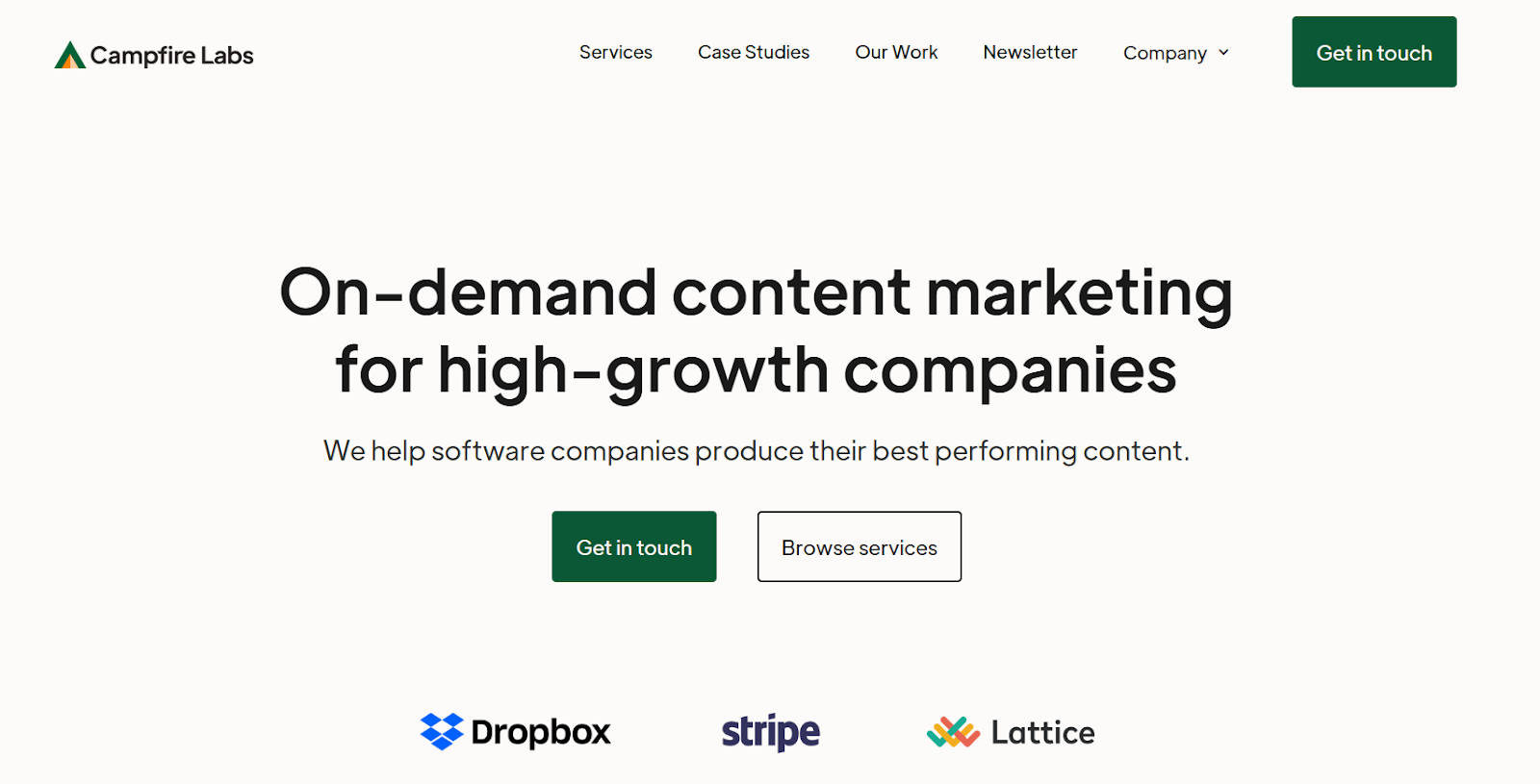 Campfire Labs works well for SaaS companies that want story-driven content to build brand authority and are looking for quality and depth over SEO volume.